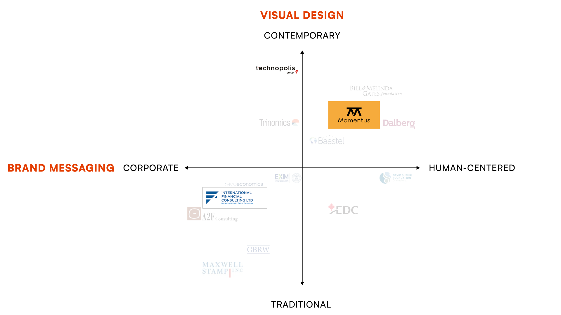 We also conducted a brand landscape audit of competitors in the sustainable finance space. This revealed a pattern of corporate messaging and indistinct visual identities, reinforcing the need for Momentus to stand out with a human, contemporary, and clearly differentiated brand.